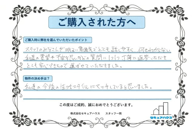 - 最初から最後まで丁寧に対応して下さり、4か月間のお付き合いでしたが、無事に良いお家に出会うことができました。たくさん振りまわしてしまいましたが、感謝でいっぱいです。