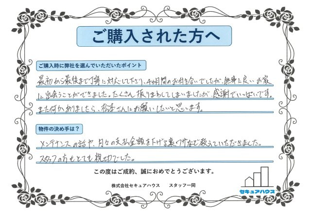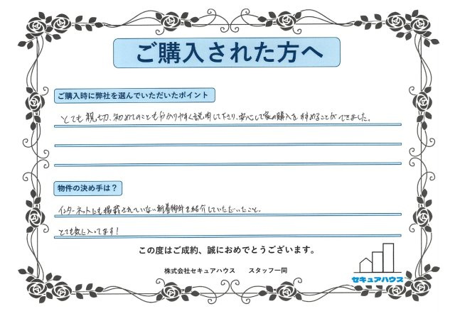 この度は、本当にありがとうございました。小林さんには最初からずっと迷惑をおかけしてしまい、私がお家を買うのは難しいかなと思いましたが、とても、とても親切、丁寧に対応してくださり感謝・感謝の気持ちでいっぱいです。これからもよろしくお願いします!